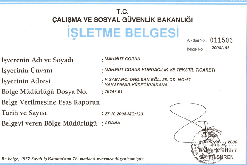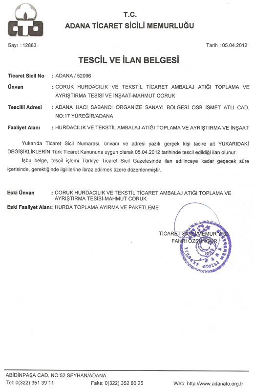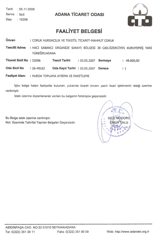Telefon : (0322) 394 38 25 Gsm : Kenan Coruk : (0542) 653 53 84 - Mahmut Coruk: Faks : (0322) 394 38 26